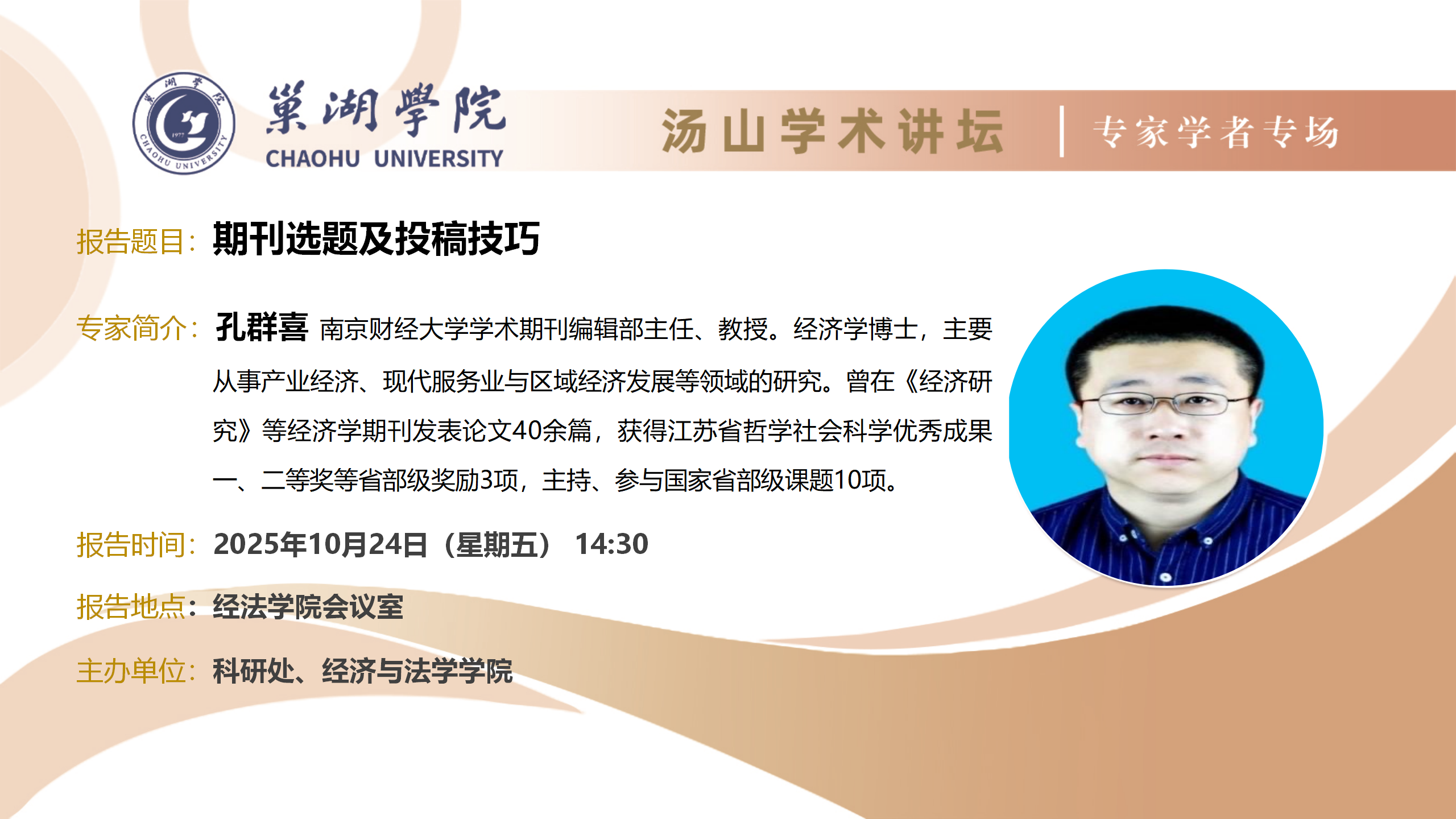 • 10月24日:南京財(cái)經(jīng)大學(xué)學(xué)術(shù)期刊編輯部主任孔群喜教授講座